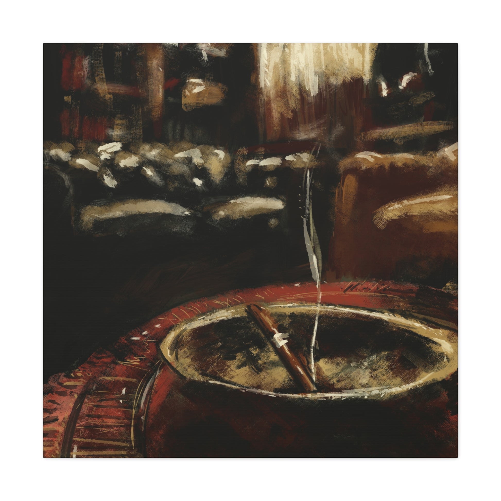 This moody canvas captures the stillness after the conversation fades, when the only thing left is smoke, leather, and memory.