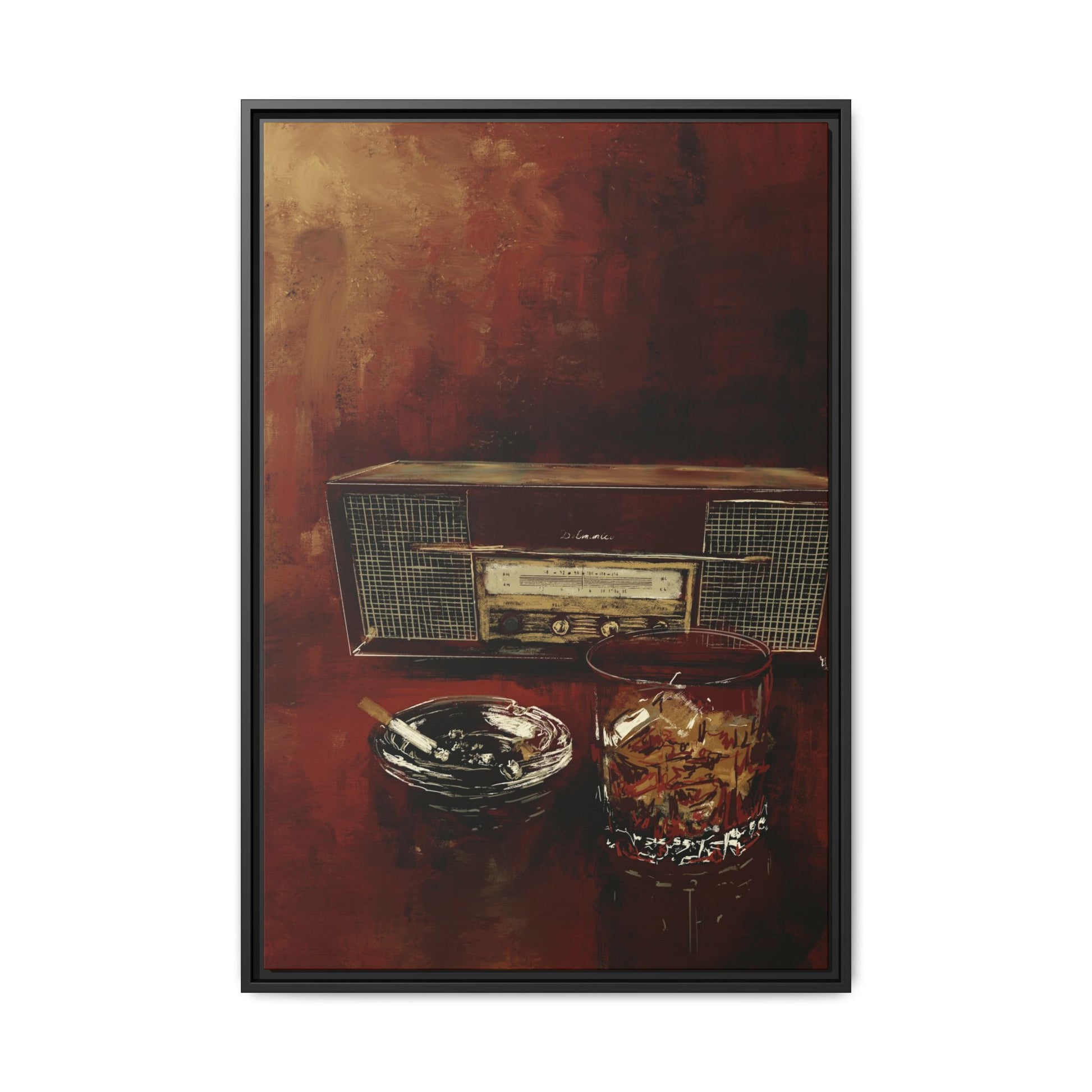 This richly toned canvas captures the golden glow of simpler vices: vintage radio, a heavy pour, and the silence between songs.